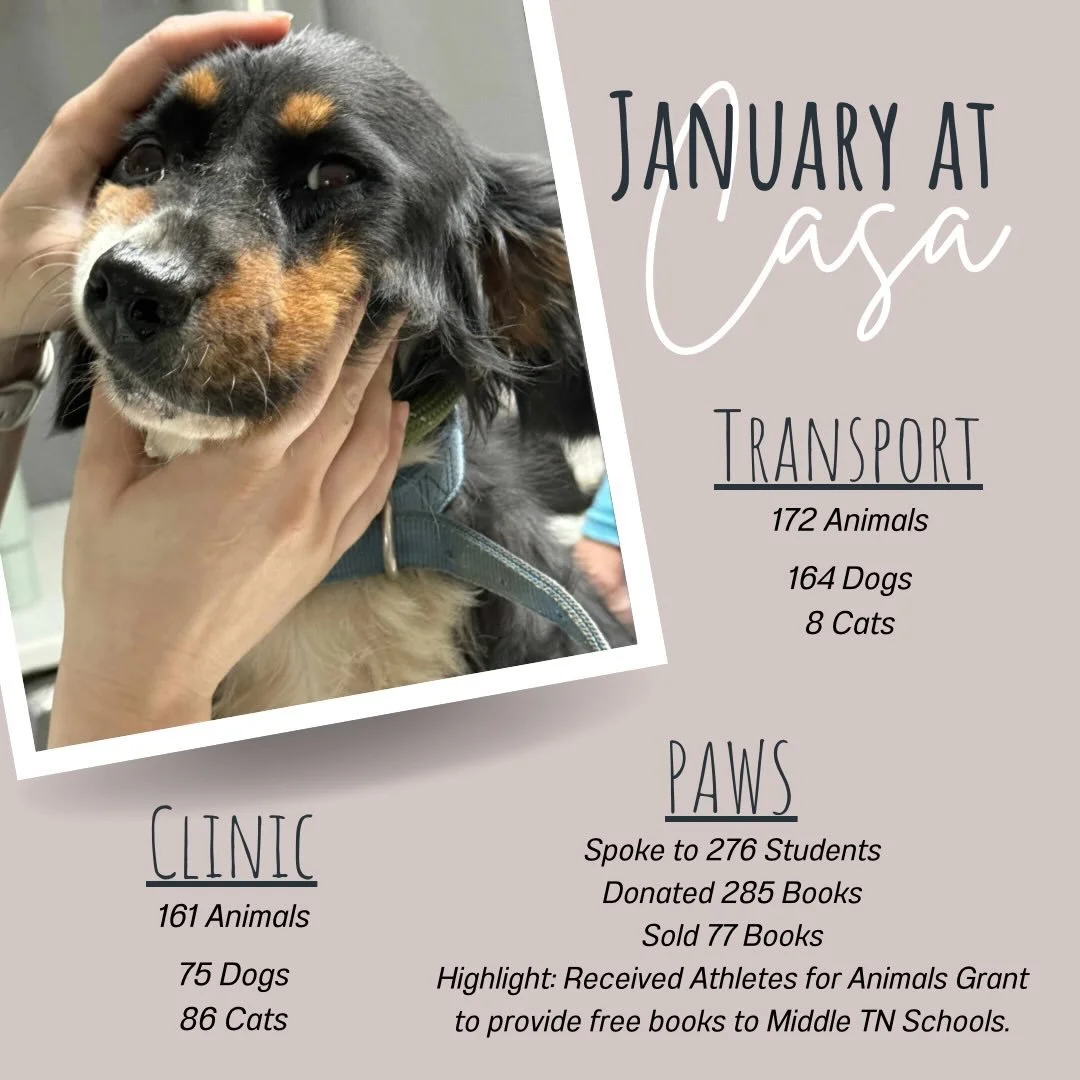 The mission of CASA is to reduce pet homelessness using a multi-faceted approach that includes rescue transports, low-cost spay/neuter, and community education - with a focus on supporting rural, underfunded shelters. By helping animals in need, and by creating a more informed public, CASA is making an immediate difference while laying the groundwork for a sustained improvement in conditions for companion pets in Tennessee and beyond.